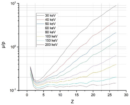 Usually, when the attenuation coefficient is plotted as a function of the incident energy of some material, as in Figure 4, some sharp bands can be observed at certain energy values; this is due to the layers of K, L, M, etc. The signal from these layers for low Z atoms begins to appear below 20 keV. While for those elements with a high atomic number, these values are above 100 keV [27].