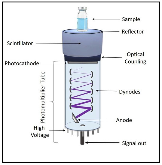 The most used detector to determine the γ radiation attenuation capacity of a material is the scintillator. In general, the scintillator detector is used to determine the transmitted energy from an absorbent located between the radiological source and the detector. As commented, the high-energy radiation produces multiple processes in matter such as the excitation of inner electrons, that among other relaxation processes can emit visible region photons, with proportional energy to incident radiation. The most commonly used scintillation detector is NaI(Tl) [36,37], showing excellent absolute efficiency. This detector corresponds to a type of inorganic scintillator, where the crystalline structure plays a fundamental role in the scintillation process. Electrons can occupy valence or conduction bands; in which they move freely through all crystals. There is a significant energy gap between the two levels. The relaxation process from the upper level by emission of a photon is unlikely, so an impurity is introduced (Tl in this case), called the activator, which modifies the crystal’s band structure, incorporating new energy levels in the previously banned band. Under these conditions, the rapid relaxation of electrons to lower levels by photon emission becomes possible. So, this is a useful scintillator due to possessing a high probability of absorption of the incident energy, having a high efficiency of emission of luminescence radiation after absorption, being transparent to its own radiations, and emitting into the spectral region to which the photomultiplier is sensitive [35]. Figure 5 shows a general scheme of such detectors. Here, we can see that the scintillator is attached to a photomultiplier through an optical coupling with a photoemissive window, allowing passage of the photon until the photocathode, where this signal multiplies around 10 times due to a series of dynodes. The dynodes’ potential is increasing to attract the electrons produced, which are located inside a vacuum glass tube; now, this electric current finishes on an anode and is translated through a processor.