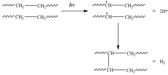 Crosslinking is a dominant phenomenon in polymer irradiation because it generates new bonds in polymer chains, that is, the formation of intermolecular bonds (Figure 6). The first radiation cross-linked polymer was polyethylene [47]. Overall, crosslinking improves the mechanical and thermal characteristics of polymers in conjunction with chemical and environmental stability. During irradiation, both chain scission polymer degradation and crosslinking occur, but one of these phenomena may dominate depending on the dosage conditions [48]. Crosslinking depends on the radiation dose to which the polymer is exposed. Unsaturation or functional groups are not an indispensable requirement for the radiation-induced crosslinking process in the polymer, but polymers that contain aromatic groups in their structure are an exception to this fact. Currently, there is no general agreement on the exact nature of the crossover mechanism. The universally accepted mechanism is the cleavage of the C-H bond in a polymer chain to form a free radical, along with the release of atomic hydrogen. Subsequently, another hydrogen atom is abstracted by cleavage of the adjacent chain to form molecular hydrogen. The polymer chains generated by free radicals chemically react to form a new bond called a crosslinked bond. The crosslinking generates an increase in the molecular weight of the polymer and the formation of branched chains according to the radiation dose used. Finally, when all the free radicals of the polymer chains combine, a three-dimensional structure is obtained [49].