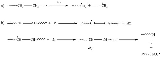 The cleavage of the C-C bonds will occur whether the radiation is higher than the bonds’ energy (Figure 7a); otherwise, cleavage will take place in C-H bonds. Regarding the radiation effect in polymers in solution, this generates solvent free radicals, which promotes the generation of free radicals in the polymer chains (Figure 7b). In addition, the presence of oxygen in a solution and its interaction with polymer free radicals yields peroxides, which decompose in smaller molecules [49].