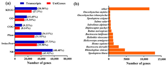 Gene annotation and homology search. (a) The number of genes using six databases. NR, Swiss-Prot, Pfam, COG, GO, and KEGG. (b) Homology search of Illumina sequences matching with the NR database. 18,935 NR-annotated transcripts sequences were analyzed for species distribution.