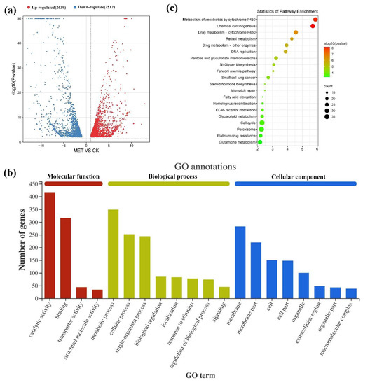 Function annotation and enrichment of DEGs. (a) Volcano plot of differentially expressed genes of S. exigua fed with MET (red spots represent significantly up-regulated genes; green spots represent significantly down-regulated genes). (b) GO function annotation analysis of S. exigua fed with MET (metabolic process under biological process had the primary number of UniGenes. The catalytic activity and binding under the molecular function were the most dominant. The membrane under the cellular component were the biggest group). (c) The most enriched KEGG pathways of S. exigua after exposure to a sublethal concentration of MET.