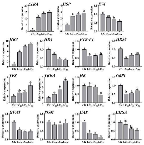 Different doses (LC10, LC30, and LC50) of MET were used to examine the dose-dependent effects in ecdysone signaling pathway gene expression in S. exigua. EcRA, USP, and HR3 were positively up-regulated and E74, HR4, FTZ-F1, and HR38 were down-regulated after the larvae were treated with different doses of MET. Notably, the up-regulation of EcRA increased to 10.85-fold under LC10 treatment, 14.02-fold under LC30 treatment, and 14.81-fold under LC50 treatment (Figure 3). TPS and TREA were up-regulated and HK, G6PI, GFAT, UAP, and CHSA were down-regulated after S. exigua were treated with different doses of MET. The up-regulation of TREA increased 1.65-fold under LC10 treatment, 2.66-fold under LC30 treatment, and 4.28-fold under LC50 treatment (Figure 3).