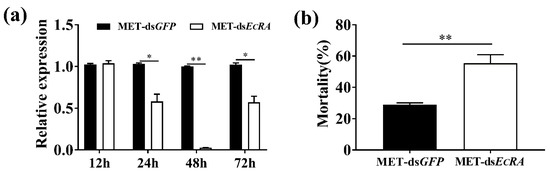 Knockdown of EcRA increases the sensitivity of S. exigua to MET. (a) Relative expression of EcRA; (b) mortality (%) of the dsEcRA-treated S. exigua at 72 h after MET treatment. The columns represent averages, with vertical lines indicating SE. Significant differences were calculated by Student’s t-test (* p < 0.05; ** p < 0.01).