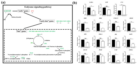 Ecdysone signaling pathway in insects. (a) 20E can bind to combine EcRA and USP, but MET can advance combination with EcRA and result in lethal molting. The compound could activate downstream genes. Downstream genes contain three category genes. The early genes contain E74, while early–late genes contain HR3, HR4, FTZ-F1, and HR38. Late genes contain chitin synthesis genes. Β-d-glucose is converted to Glucose-6-phosphate, Fructose-6-phosphate, Glucosamine-6-phosphate, N-acetylglucosamine glucosamine-6-phosphate, N-acetylglucosamine-1-phosphate, UDP-N- acetylglucosamine, and then to chitin. The activity of the enzymes encoded by TPS, TRE, HK, G6PI, GFAT, GNPNA, PGM, UAP, and CHSA. Significant differences were calculated by Student’s t-test (* p < 0.05; ** p < 0.01). (b) Relative expression of ecdysone signaling pathway genes after they were injected with dsEcRA in S. exigua under MET treatment. Columns represent averages, with vertical lines indicating SE. Significant differences were calculated by Student’s t-test (NS, p > 0.05; * p < 0.05; ** p < 0.01).