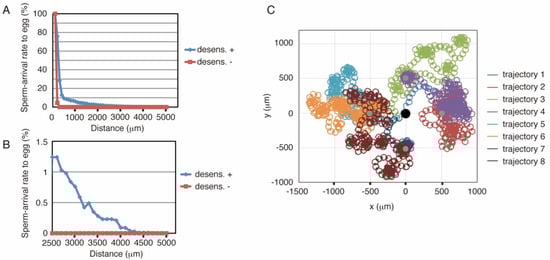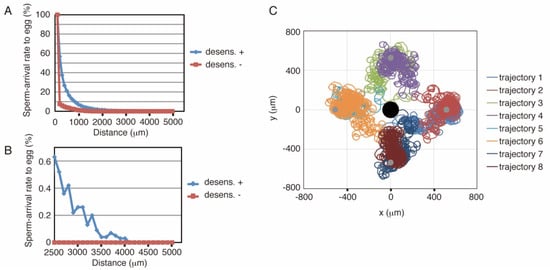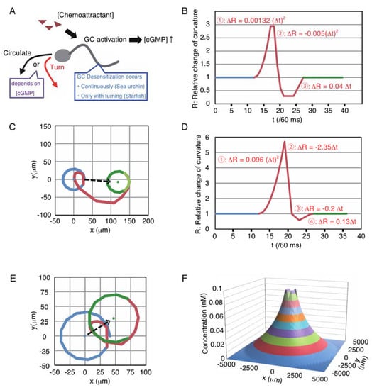 The results showed that simulations without desensitization lost the chemotactic function (Figure 2A,B and Figure 3A,B), suggesting that sperm desensitization through GC dephosphorylation is essential for long-range chemotaxis in sea urchins and starfish. In other species ascidian sperm exhibit different signal transduction, in which the sperm responds to the dissociation of the chemoattractant from its receptor [], whereas in other sea urchins, Lytechinus pictus and Strongylocentrotus purpuratus, the gradient of chemoattractant evokes [Ca2+]i oscillation in the sperm, producing a response involving a series of turns toward the egg []. It is possible that desensitization system functions in long-range chemotaxis of these animals, even though the signaling pathways are not similar. Moreover, adjustment of sperm sensitivity would be needed for successful fertilization also in complex animals such as mammals, in which a chemoattractant can be more than one.