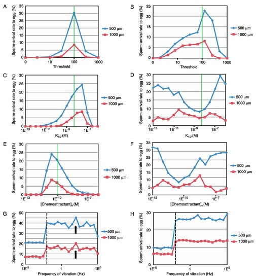 Further analysis of models. (A–F) Summarized graphs of simulations with modification in parameters and the threshold for [cGMP]i, K1/2, and [Chemoattractant]s. The y-axis shows the egg-arrival rates of sperm (n = 10,000), with the modification in each parameter shown as the abscissa axis. (A,C,E) correspond to the sea urchin models. (B,D,F) represent the starfish models. Green lines indicate the original values of the parameters. (G,H) Effects of physical disturbances in the sea urchin model (G) and starfish model (H). The y-axis shows the egg-arrival rates of sperm (n = 10,000), with the frequency of sine-wave oscillation shown as the x-axis. The broken line represents 0.01 Hz, and the arrowhead in G indicates a local maximum at 100 Hz.