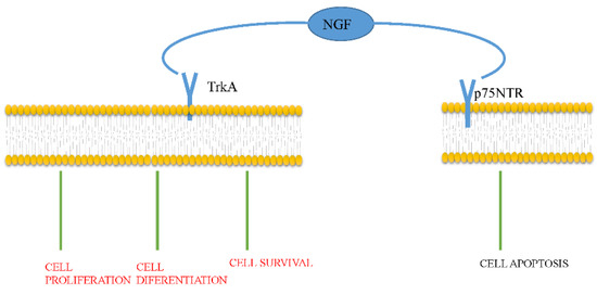NGF activates two sorts of receptors: the high-affinity tropomyosin-related kinase A receptor (TrkA) and the low-affinity p75 neurotrophin receptor (p75NTR) [14]. The TrkA receptor, a 140-kDa transmembrane protein, is encoded by a proto-oncogene on chromosome 1. Due to its intrinsic tyrosine kinase activity, TrkA selectively binds to NGF. When TrkA is activated, NGF induces cell proliferation, cell differentiation, and cell survival. In addition, TrkA inhibits apoptosis, increases the excitability of neurons, and induces mediator release. The p75NTR receptor, encoded by a gene situated on chromosome 17, is a 75-kDa glycoprotein. It combines all neurotrophins and the prosoma (pro) of neurotrophins, most notably pro-NGF. After pro-NGF binds to p75NTR, apoptosis is activated (Figure 1).