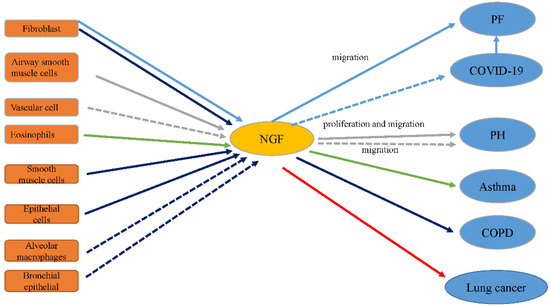 The expression levels of NGF and its receptors TrkA and p75NTR are increased in fibrotic lung tissue compared to normal tissue [17]. Monocrotaline-induced PH is related to increased NGF levels in lung tissue [18]. NGF, a critical mediator in neuro-immune mechanisms of asthma, aggravates inflammation in asthma and airway remodeling [19]. NGF boosts angiogenesis in tumor tissue, including non-small cell lung cancers (NSCLCs) [20]. Serum levels of NGF are also extremely high in COPD subjects [14]. This suggests that PF, PH, asthma, NSCLC, and COPD are associated with NGF (Figure 2). In the following sections, the relationship between NGF and these lung diseases is described in detail.