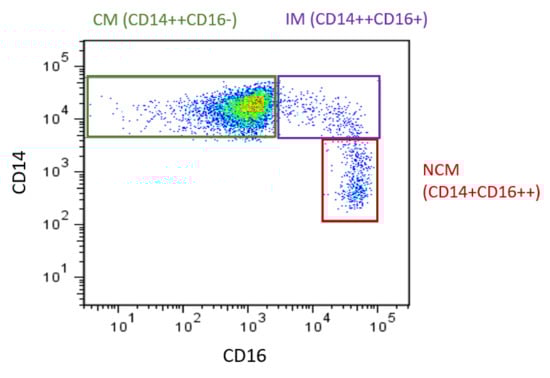 Monocyte subsets in humans. Flow cytometry plot produced by the authors displaying monocyte subsets from a healthy control. Monocytes are defined using CD14 and CD16. CM: classical monocytes, IM: intermediate monocytes, NCM: nonclassical monocytes.