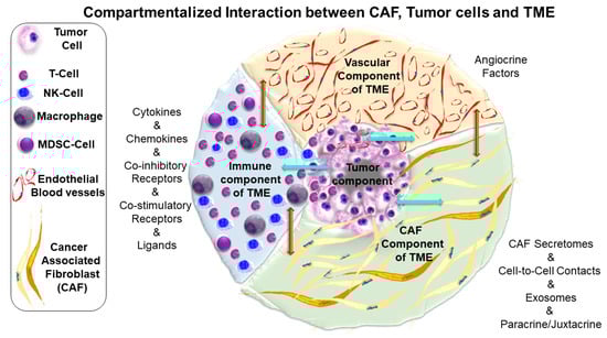 Diagrammatic representation of the compartmentalized relationship of cancer-associated fibroblasts (CAF) with tumor cells and other components of the tumor microenvironment (TME): CAF interacts and has a bidirectional influence on other two major components of TME, including the immune component and vascular component (vertical brown arrows). All three components of TME interact (vertical brown arrows) and have bidirectional interaction with the tumor compartment (horizontal cyan arrows). The bidirectional interactions are not compartmentalized in space as all the components are in close proximity for autocrine/paracrine interactions but compartmentalized on a cell-to-cell basis. CAFs have distinctly compartmentalized bidirectional interactions with cells of the immune component and vascular component of TME, which are distinct from the bidirectional interactions with tumor cells. These characteristic interactions are (1) via secretomes, (2) autocrine, paracrine, and angiocrine in nature, and/or (3) cell-to-cell interactions. Interestingly, the bidirectional interactions are also in real-time. For example, CAF’s interaction with other components of TME and tumor cells changes following treatment of the tumor with drug(s), which may be functionally connected to the development of resistance. Schematically, each component of TME is compartmentalized, and a few cells of each component are presented within the tumor compartment. Heterogeneity of CAF is represented in two shades of color.