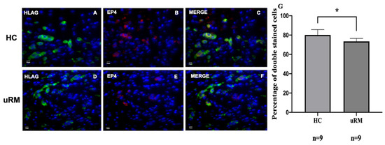 Double immunofluorescence analyses of EP4 and HLAG shown in the decidua of uRM patients and healthy controls. EP4 is co-expressed with HLAG in the cytoplasm of extravillous trophoblast cells (A–F). The percentage of double staining cells were counted in HLAG+ EP4+/HLAG+ cells over nine slides. The expression of EP4 in EVTs was decreased in uRM patients compared to healthy controls (G). HLAG is specific marker for extravillous trophoblast cells (EVTs). The picture is shown in its original magnification of 40×. * p < 0.05.