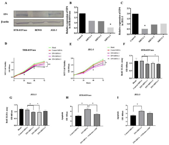 EP4 knockdown inhibits proliferation and induced apoptosis in vitro. (A). The expression protein EP4 is higher in HTR-8/SVneo and JEG-3 cells than BEWO. (B). The mRNA expression of EP4 in HTR-8/SVneo after knockdown with siRNA was detected by RT-PCR. (C) The mRNA mRNA of EP4 in JEG-3 after knockdown with siRNA was detected by RT-PCR. (D) MTT assays indicated that downregulated EP4 decreased the viability of HTR-8/SVneo compared to the negative control. (E) The MTT assay indicated that downregulated EP4 decreased the viability of JEG-3 compared to the negative control. (F) BrdU assay suggested that the proliferation of HTR-8/SVneo is inhibited by EP4 knockdown compared to the negative control. (G) BrdU assay suggested that the proliferation of JGE-3 is inhibited by EP4 knockdown compared to negative control. (H) The apoptosis test showed that the apoptosis of HTR-8/SVneo with EP4 siRNA is improved compared to the negative control and the effect was reversed by 8-Bromo-cAMP. (I) The apoptosis test showed that the apoptosis of JGE-3 with EP4 siRNA is reduced compared to the negative control. * p < 0.05.
