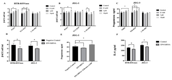 The expression levels of β-hCG, progesterone, and IL-6 in the supernatants of HTR-8/SVneo and JEG-3 cells after incubation with PGE2, TCS 2510, L-161,982 and siRNA. (A) The secretion of β-hCG was increased by 1 μM PGE2, 1 μM and 10 μM TCS 2510 in THR-8/SVneo. (B) The secretion of β-hCG was increased by 10 μM PGE2 and inhibited by 0.1 μM L-161,982 in JEG-3. (C) The production of progesterone in JEG-3 was increased by 10 μM PGE2, 1 μM and 10 μM TCS 2510. (D) β-hCG levels in the supernatants of HTR-8/SVneo and JEG-3 cells were dropped after slicing EP4 compared to negative control. (E) Progesterone levels were decreased in the supernatants of JEG-3 cells after slicing EP4 and EP4 added 8-Bromo-cAMP compared to negative controls. (F) IL-6 levels were attenuated in the supernatants of HTR-8/SVneo and JEG-3 cells after knockdown of EP4 compared to negative controls. * p < 0.05.