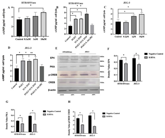 The expression levels of cAMP, EP4, PKA and p-CREB were changed by EP4 knockdown. (A) The secretion of cAMP was increased by 10 μM PGE2 in HTR-8/SVneo.(B) The secretion of cAMP was increased by PGE2, TCS 2510, PGE2 + TCS 2510 and inhibited by PG2 + L-161,982 in HTR-8/SVneo. (C) The production of progesterone in JEG-3 was increased by 1, 10 μM PGE2. (D) cAMP levels in the cell lysis of JEG-3 was increased by PGE2, TCS 2510, PGE2 + TCS 2510. (E) Western blot analysis showed EP4, PKA, p-CREB, CREB in HTR-8/SVneo and JEG-3 cells after silencing the EP4 gene compared with the negative control. (F) The density value of EP4 in HTR-8/SVneo and JEG-3 cells after knockdown of EP4 compared to negative control. (G) The density value of PKA in HTR-8/SVneo and JEG-3 cells after knockdown of EP4 compared to negative control. (H) The density value of PKA in HTR-8/SVneo and JEG-3 cells after knockdown of EP4 compared to negative control. * p < 0.05; ** p < 0.01.
