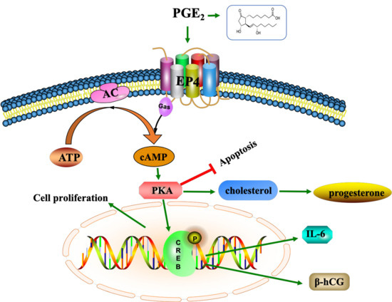 Furthermore, PKA can also inhibit AMP-activated protein kinase (AMPK) activity, which is responsible for the inactivation of hormone-sensitive lipase, thereby reducing the ability of LH or PGE2 to provide cholesterol for progesterone synthesis [34]. Waclawik et al. reported that estradiol-17β and progesterone increase the production of PGE2 in response to luteinizing hormone (LH) in endometrial stromal cells [35]. These findings suggest that PGE2 may be involved in a positive feedback loop during the progesterone synthesis in cells. Moreover, studies demonstrated that PGE2 improved endometrial receptivity via EP2 and EP4, acts through autocrine or paracrine pathways in vivo, and is regulated by progesterone secretion through the cAMP/PKA pathway [36,37,38]. β-hCG promotes angiogenesis in uterine vasculature, promotes the fusion of cytotrophoblast cells and differentiation to make syncytiotrophoblast cells, and causes the blockage of any immune or macrophage action by the mother to foreign invading placental cells [39]. Generally, β-hCG and progesterone also promoted maternal immune tolerance to control EVT functions and maintain embryonic–maternal communication. According to the above results, we suggest similarity and synergetic effects among PGE2 and β-hCG and progesterone pathways in HTR-8/SVneo and JEG-3 cells, and they trigger the process via activating adenylate cyclase to increase cAMP concentrations. PGE2, through its nuclear receptor PPARγ, effects trophoblast differentiation to activate downstream targets genes, and this regulation process is mainly mediated through chorion-specific transcription factor-1 (GCM-1) and increased expression of β-hCG [40,41].
