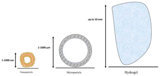 Schematic representation of the sizes of the three main types of drug delivery systems: the nanoparticle (size range 1–1000 nm), the microparticle (up to 10 μm), and the hydrogel (up to 10 mm). NOTE: the images are not in real proportions.