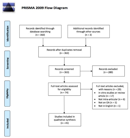 The present systematic review was written according to the Preferred Reporting items for Systematic Reviews and Meta-analysis (PRISMA) guidelines [], whose flowchart is depicted in Figure 2. A comprehensive search of PubMed, Google Scholar, Cochrane, and EMBASE was performed using various combinations of the following keywords: “Knee osteoarthritis,” “Drug delivery,” “Microparticles,” “Nanoparticles,” “Hydrogels.” The last research was performed on 14 June 2021 and two independent reviewers conducted the research independently (F.M.G. and A.U.). All 360 articles obtained by the literature search were screened according to the following inclusion criteria: (i) employment of a drug delivery system for the treatment of knee osteoarthritis; (ii) in vivo study; and (iii) knee intra-articular (IA) route of administration. Exclusion criteria were: (i) in vitro studies or review articles; (ii) other delivery methods than intra-articular application (e.g., transdermal application), (iii) not focused on osteoarthritis; (iv) not written in the English language.
