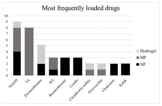 Among the 45 included studies, the most frequently loaded drug category was represented by corticosteroids (16 studies); indeed, eight studies employed triamcinolone acetonide, five dexamethasone, and three betamethasone. The second most employed drug category was represented by NSAIDs (nine studies); in particular, three studies employed lornoxicam, two indomethacin, one ibuprofen, one naproxen, one diclofenac, and one piroxicam. Among the other molecules presenting a measurable pharmacological effect, hyaluronic acid, COX-2 specific inhibitors (coxib), chondroitin sulfate, clodronate, and KAFAK have been studied. Finally, the following drugs were employed only by a single study: methotrexate, adenosine, curcumin, oleic acid, NO-Hemoglobin Notch-1 siRNA, methyl prednisolone, antisense oligomers, eicosatetraenoic acid, rapamycin, and quercetin. Concerning the effects observed after treatment according to the drug used, the coxib group showed the most consistent improvement; all the studies employing either etoricoxib [] or celecoxib [,] reported a better histological outcome after treatment. Instead, focusing on the IA concentration change in cytokines, a decrease in IL-1β, IL-6, TNF- α, MMP-3 was observed with all the main drug categories, i.e., with glucocorticoids [], NSAIDs [], and coxibs []. All the included studies on humans [,,,], employed triamcinolone acetonide. A graphic representation of the distribution of loaded drugs based on the type of nanomaterials is provided in Figure 4.