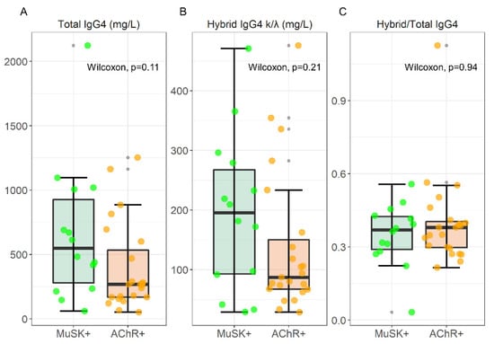 A box plot analysis of total IgG4, hybrid IgG4 k/λ, and the hybrid/total ratio is visualized in Figure 2, together with the results of a Wilcoxon Unpaired two-sample test; data are reported as median [IQR] in Table 1. For this evaluation, we analyzed serum samples from 14 MuSK-MG and 24 AChR-MG pts.