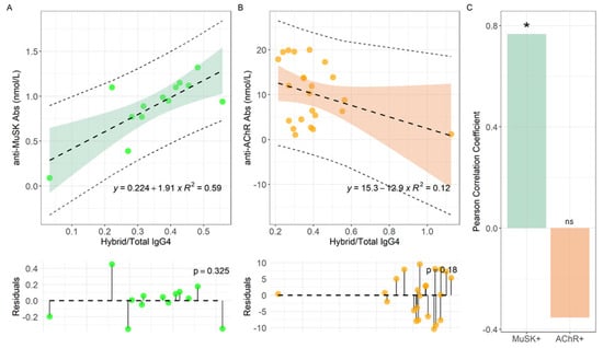 Linear regression analyses of anti-MuSK Abs levels versus Hybrid/Total IgG4 ratio for MuSK-MG (A) and AChR-MG (B) pts, with the corresponding Pearson correlation coefficient (C). Serum samples were analyzed for each MG-pt (n:14 for MuSK-MG and n:24 for AChR-MG). *: p < 0.01. ns: not significant.