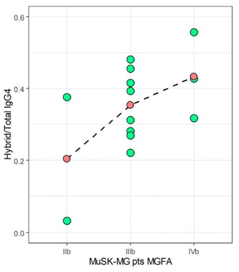 To verify if hybrid IgG4 plays a pathogenic role as already reported [11,12,13], we analyzed the correlation between hybrid/total IgG4 ratio and disease severity. In Figure 4, we visualized the distribution of Hybrid/Total IgG4 ratios at different MGFA scores for 13 out of 14 MuSK-MG pts who were evaluated for the MGFA at the time of withdrawal. As shown, despite the very limited number of samples prevents us from any statistical consideration, we noticed a progressive increase of the titer with the increasing of MGFA score. Specifically, IIb MuSK-MG pts had the lowest mean ratio of 0.20, IIIb pts an intermediate mean value of 0.35, and IVb pts showed the highest mean value of 0.43. These results are suggestive that the hybrid/IgG4 ratio correlates with disease severity, but this finding deserves a better in-depth study in a larger sample size to be confirmed.