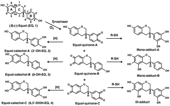 Tanaka, H.; Ito, S.; Ojika, M.; Nishimaki-Mogami, T.; Kondo, K.; Wakamatsu, K. The Oxidation of Equol by Tyrosinase Produces a Unique Di-ortho-Quinone: Possible Implications for Melanocyte Toxicity. Int. J. Mol. Sci. 2021, 22, 9145. https://doi.org/10.3390/ijms22179145