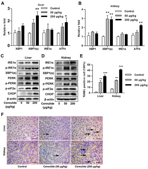 Based on the results that cereulide exposure induced severe oxidative stress in the liver and kidney of mice, we addressed if cereulide induced ER stress in liver and kidney tissues, because oxidative stress is one of the important causes of ER stress. Considering that the pathological changes are not obvious in the 10 μg/kg group, we focused on the effect of cereulide exposure at 50 and 200 μg/kg in mice. Administration of cereulide increased the mRNA levels of XBP1s and activating transcription factor 4 (ATF4) in liver and kidney tissues with a dose-response relationship (Figure 2A,B). The protein or phosphorylation levels of IRE1α/XBP1(s) and PERK/eIF2α/CHOP were also increased at 50 and 200 μg/kg of cereulide exposure (Figure 2C,D). CHOP is a transcription factor that mediates apoptosis induced by ER stress. Therefore, the degree of apoptosis of liver and kidney tissues is detected by TUNEL assay. The results showed that the number of apoptotic cells was significantly increased when mice exposed to cereulide at 50 and 200 μg/kg. It is worth noting that apoptotic cells are mainly distributed around the central vein and renal tubules (Figure 2E,F). The animal experiments suggested that cereulide exposure induces ER stress, which further leads to apoptosis.