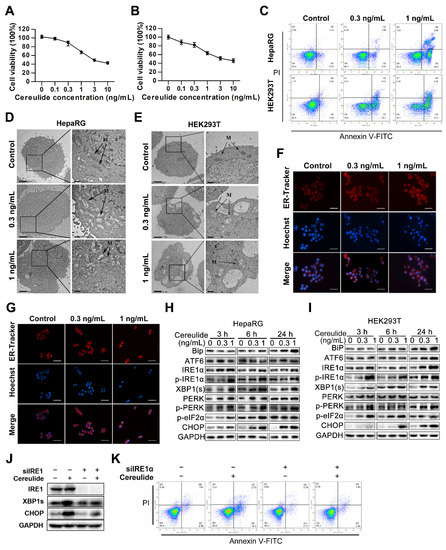 We have found that cereulide induced ER stress in animal models. Next, we tested this finding in HEK293T cells and HepaRG cells to explore the underlying toxicological mechanism. Firstly, ER was stained with ER-tracker, a red fluorescent probe specifically dying ER, and showed that the ER was swollen in both 0.3 ng/mL and 1 ng/mL of cereulide administrations (Figure 3F,G). Second, we found that cereulide can cause ER stress to upregulate the expression of the pro-apoptotic transcription factor CHOP, which is obviously time- and dose-dependent (Figure 3H,I). Besides of that, with the increase of time and concentrations in cereulide treatment, the phosphorylation levels of IRE1α and PERK were increased significantly, suggesting that IRE1α and PERK were activated, which consequently promoted the transcription factor XBP1 splicing and increased the phosphorylation level of eIF2α (Figure 3H,I). No apparent increase of BiP level was observed at the exposure time 3 h and 6 h, but BiP significantly increased at 24 h exposure (Figure 3H,I). All these data showed that cereulide stimulation triggered ER stress in HepaRG and HEK293T cells. In HepaRG cells, IRE1α knockdown reduced the upregulations of XBP1s and CHOP expression caused by cereulide exposure (Figure 3J), and alleviated cereulide-induced apoptosis (Figure 3K). These data indicated the critical role of ER stress in cereulide-induced toxicosis.