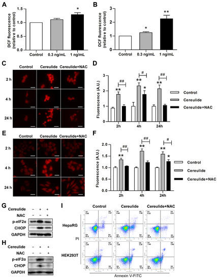 Cereulide induces ER Stress response by ROS production. (A,B) Cereulide causes an increase in ROS production. HepaRG and HEK293T cells were treated with 0, 0.3, 1 ng/mL cereulide for 24 h, the fluorescence of dichlorofluorescindiacetate (DCF) were detected at 488 nm excitation and 525 nm emission; n = 5. (C,D) Effects of ROS inhibitor on ROS production after cereulide treatment. HEK293T cells were pretreated with 5 mM NAC followed by treatment of 0.5 ng/mL cereulide for 2, 4, 24 h. Cytosolic ROS production measured by DHE labeling, n = 5. (E,F) HepaRG cells were pretreated with 7 mM NAC followed by treatment of 1 ng/mL cereulide for 2, 4, 24 h; n = 5. For C and E panels, image magnification: ×400; scale bar = 50 µm. (G,H) ROS inhibitor relieves ER stress caused by cereulide. According to the dosage described above, HepaRG and HEK293T cells were treated for 4 h and Western blot analysis for p-eIF2α, CHOP. (I) NAC treatment reduce the apoptosis caused by cereulide. HepaRG and HEK293T cells were treated as described above and then evaluated by flow cytometry; n = 3. For all panels, * p < 0.05 and ** p < 0.01 compared to the control cells; # p < 0.05 and ## p < 0.01 compared to NAC treated cells.