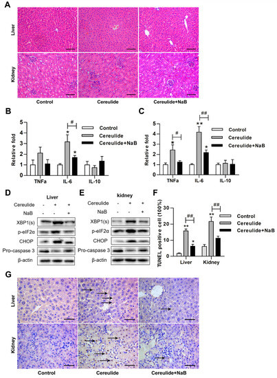 NaB relieves cereulide-induced liver and kidney damage by inhibiting ER stress. (A) Representative images of H&E-stained liver and kidney tissues from cereulide + NaB-treated mice and cereulide-treated mice (×200 magnification). (B,C) The mRNA levels of TNF-α, IL-6 and IL-10 were detected in liver and kidney tissues by RT-qPCR, n = 5. (D,E) Western blot analysis for XBP1(s), p-eIF2α, CHOP and Caspase3 in the liver and kidney tissues of mice that exposed to cereulide (50 μg/kg) were treated with NaB (100 mg/kg) for 28 days. (F,G) TUNEL analysis of apoptosis level in liver and kidney tissue of mice exposed to cereulide (50 μg/kg) and cereulide + NaB (100 mg/kg) (×400 magnification). Arrows indicated apoptotic cells. Data are presented as the mean ± SD (n = 6). For all panels, * p < 0.05 and ** p < 0.01 compared to the control group; # p < 0.05 and ## p < 0.01 compared to cereulide + NaB group.