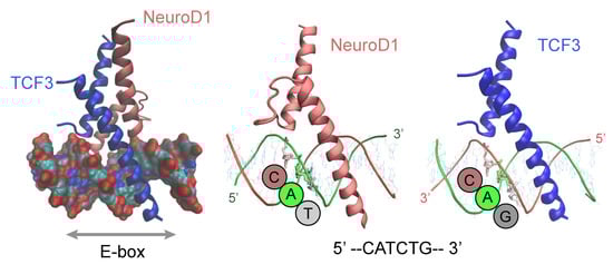 Furthermore, as the cooperative complex stabilizes protein-DNA interactions, it allows transcription factors to bind suboptimal sequences, which could not bind individually []. For example, it has been shown that in the myogenin promoter, DNA-bound Pbx1A-Meis1 dimers recruit MyoD to non-canonical E-box sequences [,]. Analogously, Myc is recruited by resident chromatin proteins and by proteins of the transcriptional machinery to promoters, which allows binding to less preferred E-box, and even to random sequences [,]. In the case of PTF1-RBPJ1, both factors allow variations in their cognate sequences []. Interactions with cooperating factors can also modify the structure of the bHLH dimer, altering its DNA recognition. For example, in hematopoietic cells, TAL1-E47 (a splice variant of TCF3) dimers, bind to the bridging cofactor LMO2, which in turn interacts with different transcription factors that determine the complex’ target specificity: Sp1 in hematopoietic progenitors [], GATA1/2 in erythroid cells [,,,] and RUNX1, ETS1 and GATA3 in leukemogenic T-cells [,]. Interaction with LMO2 modifies the bHLH dimer in such a way, that in most cases, only E47 and not TAL1 binds DNA, to a TG dinucleotide 7-9bps upstream the sequence motif of the cooperating factor [,,,].