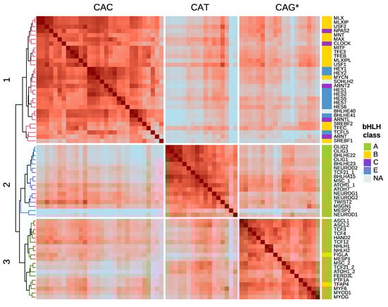 Heatmap representing motif similarity values among bHLH TFs calculated in Lambert et al. [] from data derived from high-throughput in vitro assays of bHLH homodimers. Hierarchical clustering identifies three groups with a preference for E-boxes containing CAC (cluster 1, red), CAT (cluster 2, blue) and CAG half-sites (cluster 3, green). Homodimers of clusters 1 and 2 bind symmetrical CAT-CAT or CAC-CAC E-boxes, while members of cluster 3 require the presence of CAG in at least one of the half-sites (this difference is indicated by *). A TF can appear in multiple clusters if it is represented by multiple annotated motifs, but when all of them belong to the same cluster, the TF is only shown once. bHLH classes determined by Atchley and Fitch [] and Ledent et al. [] are shown on the right column.