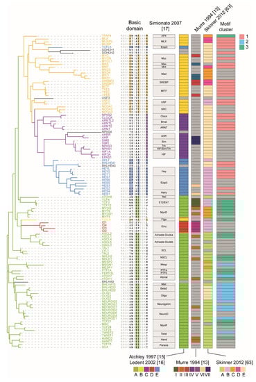 Given this relationship between amino acids in the basic domain and DNA motif preferences, it is not surprising that the phylogenetic tree of bHLH factors inferred from the bHLH domain was found largely aligned with three previously determined groups (A, B, C) based on similarity in binding affinities [,,] (Figure 3). Two more groups, D [], and E [], were added based on both phylogeny and binding preferences, forming the phylogenetic classification of five classes that we will use throughout the text. The study of the alignment of the basic domain yielded 5 positions (5, 6, 8, 9, 13) that better classified those five groups [] (shown in Figure 3). Additionally, multivariate discriminant analysis applied on multiple amino acid features, including polarity, hydrophobicity and secondary structure, among others, highlighted positions 8, 9, 10, 12, all in the basic domain, and position 49, in the loop between the two helices, to collectively explain 86% of inter-group bHLH variation [].