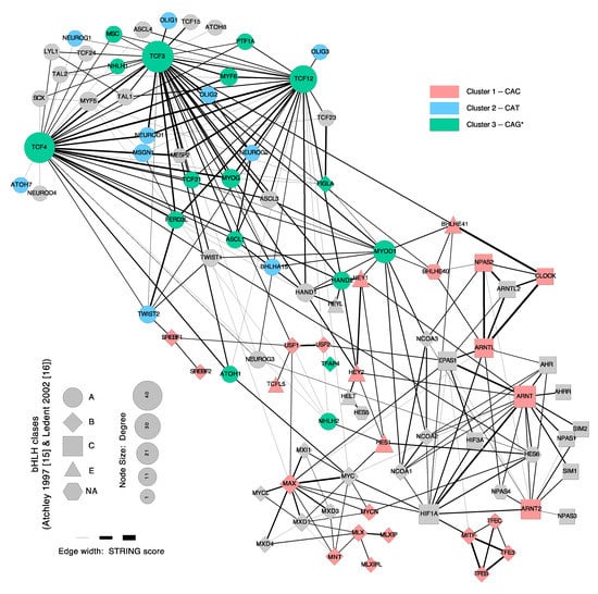Network representation of protein-protein interactions among bHLH TF catalogued in the STRING database. Only experimental/biochemical score was taken into account, from experiments of human and mouse proteins. When experimental data was available for both species, the highest score was considered. STRING score is reflected in the width of edges in the network, while the size of each node represents its degree centrality. The shape of each node indicates the bHLH classification by Atchley and Fitch [] and Ledent et al. []. Nodes are colored by the motif similarity cluster derived from Figure 2. (The difference of CAG is indicated by *).