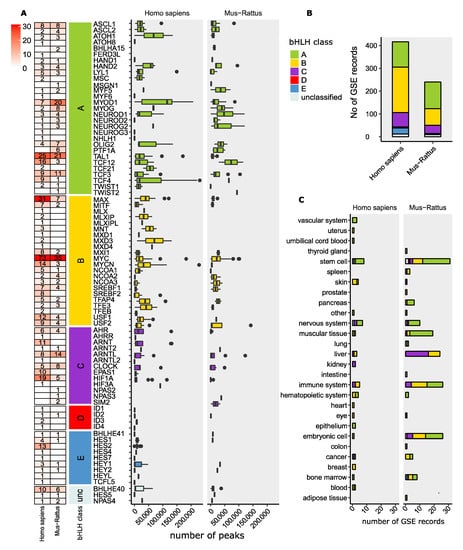 Summary measures of ChIP-seq experiments conducted on bHLH TF using data collected from GTRD (https://gtrd.biouml.org, accessed on 17 May 2021) (A) Number of GSE records for each available bHLH transcription factor (32 had no available data in GTRD, see Table S1. Boxplot shows the number of peaks detected by MACS2 for each transcription factor averaging over the sum of experiments with the same GSE record ID, variability of numbers could reflect technical or biological differences among conditions and replicates. (B) The number of studies conducted in each class of bHLH in humans and rodents. (C) Barplot showing the distribution of tissues evaluated by ChIP-seq experiments stratified by species and representing the contribution of each bHLH class.