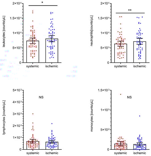 We additionally and independently analyzed immune cell counts in the subgroup of patients (n = 23) with tandem lesions at the cervical ICA level (i.e., stenosis > 50%, percutaneous transluminal angioplasty, stenting, and ipsilateral dissection). These data are given in Figure 4. Intraindividual analyses of these patients (i.e., immune cell counts from ICA lesion level vs. cerebral-ischemic immune cell counts) revealed a shift towards higher total and differential leukocyte counts at the ICA lesion level, which was statistically significant for monocytes (+29.3%, ICA lesion: 128/µL, 95% CI 74 to 182 vs. I: 99/µL, 95% CI 60 to 138, p = 0.0426).