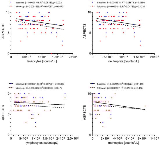Associations of cerebral-ischemic immune cell recruitment with baseline and follow-up infarct extent as assessed by ASPECTS are shown in Figure 3. Local cerebral-ischemic total leukocyte counts were correlated with reduced baseline (β = −0.0001149, R2 = 0.08382, p = 0.032) and follow-up (β = −0.0001299, R2 = 0.07097, p = 0.0472) ASPECTS, translating into a decrease of 1 baseline ASPECTS point for every increase of 8211 total leukocyte counts/µL. Local neutrophil counts were also correlated with infarct extent prior to recanalization (β = −0.0001218, R2 = 0.08878, p = 0.0356). None of the other differential leukocyte counts was associated with infarct extent on baseline or follow-up imaging.