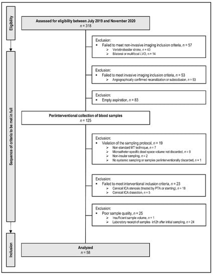 Of these n = 318 patients, n = 43 were excluded for vertebrobasilar occlusion sites, and n = 14 patients for bilateral or multifocal occlusions other than the ipsilateral ICA or MCA. Of the remaining n = 261 patients, n = 53 patients failed to meet study inclusion criteria either because of angiographically proven sub-occlusion with residual antegrade blood flow or complete recanalization. Intraprocedural microcatheter aspiration of local cerebral-ischemic blood samples was attempted in n = 208 patients. According to the study protocol, precise occlusion locations were angiographically proven and limited to the following sites of anterior circulation LVO: ICA-T, MCA M1, and proximal M2 segment. Local microcatheter aspiration was attempted in all n = 208 patients but remained empty (sicca) in n = 83/208 patients. It succeeded in n = 125/208 patients (60%). Of these n = 125 patients, n = 19 patients were excluded for protocol violations of the sampling technique or sampling order (e.g., inadvertent reversal of sampling order local vs. systemic, non-insular target location, omission of second/control sample). N = 23 patients were excluded because of the relevant tandem lesion at cervical level (stenosis > 50%) with or without subsequent percutaneous transluminal angioplasty (PTA) and/or stenting, also including cases with primary or secondary dissection of ipsilateral cervical ICA [,]. These cervical tandem lesions were considered as potentially powerful confounders from a priori since local vascular inflammation should be expected at these cervical sites []. N = 25 patients could not be included for reasons of poor sample quality or of deviation from the sample pre-processing protocol (insufficient sample volume or time delay > 12 h between sampling and sample analysis). At the end of consecutive patient flow, n = 58 patients met all a priori defined clinical-radiological, sampling, interventional, and laboratory criteria of study inclusion.