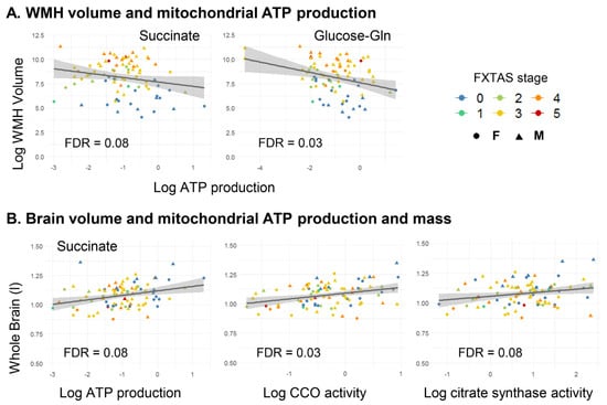 Importantly, peripheral mitochondrial ATP production fueled by succinate or glucose-glutamine correlated negatively with brain WMHV (semi-partial r = −0.26 and −0.33, FDR = 0.03–0.08), and mitochondrial mass and succinate-fueled oxygen-linked ATP production correlated positively with BV (semi-partial r = 0.25–0.32, FDR = 0.03–0.08) when combining all premutation carriers (Table 2, Figure 2A,B). However, these correlations were no longer significant when age was included as a covariate implicating a critical role for age in mediating the associations between brain imaging findings and peripheral mitochondrial outcomes. This model also suggests that in patients with FXTAS, the decline in bioenergetics (function) is maintained across stages preceding the development of more detrimental phenotypes as indicated above.