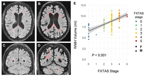 WMHV was also lower in females than males (FDR = 0.01) regardless of the premutation status. However, in a post-hoc analysis including only premutation carriers, this significance was no longer observed after adding FXTAS stage as a covariate, suggesting that WMHV is mainly impacted by FXTAS progression. These findings are consistent with an early study that reported increased WMHV in PFX+ compared with both PFX− and non-carriers of the same sex but, contrary to our findings, no differences in WMHV were identified between sexes []. This discrepancy may originate from the uneven sex distribution of carriers across FXTAS stages, females being more numerous than males at lower FXTAS stages (75% females vs. 25% males at stages 0 and 1) and males being more numerous than females at higher FXTAS stages (11.5% females vs. 88.5% males at stages 4 and 5).