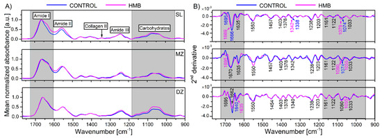 (A) Mean (n = 75 spectra) FTIR spectra of the cartilage matrix from control (blue line) and HMB-treated pigs (magenta line) in three regions after background correction and normalization based on the amide I band intensity, and (B) mean second-derivative spectra from the same samples calculated using the Savitzky-Golay algorithm with nine smoothing points. The second-derivative band assignments were given in Table 1. The band positions in black indicate the same values for all samples. HMB—supplemented group, SZ—superficial zone, MZ—middle zone, DZ—deep zone.
