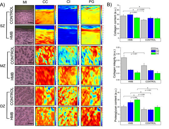 As shown in Figure 2A, chemical maps present cartilage samples as distributions of functional groups characteristic of the selected components of cartilage, namely collagen and proteoglycans. Chemical maps converted into quantities proportional to the integrated area of the chosen bands were used to characterize its structural parameters quantitatively. Mean values of collagen content (CC), collagen integrity (CI) and proteoglycans content (PG) were compared between the control and HMB groups in each zone (complete data available in the Supplementary Material, Figures S1–S3).