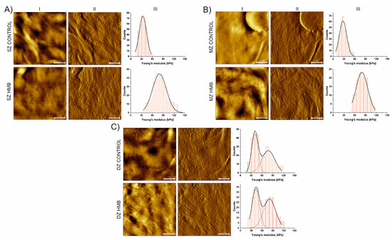 Height (I) and vertical deflection (II) images of AC zones with corresponding histograms of Young’s modulus distribution (III) determined for SZ (panel A), MZ (panel B) and DZ (panel C) with Gaussian functions fitted. Scale bars are equal to 2 µm. HMB—supplemented group, SZ—superficial zone, MZ—middle zone, DZ—deep zone.