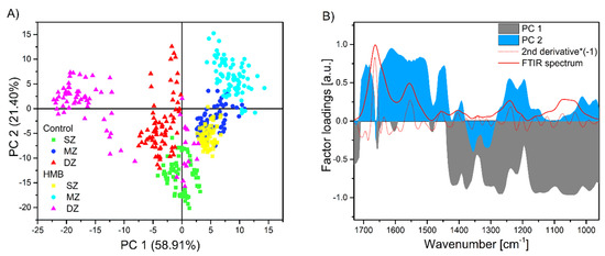 The principal component analysis is one of the most popular methods applied in the feature extraction process [68]. The PCA algorithm creates new features, lower in dimension, that project the original feature vectors into a new space. This reduction is achieved by a linear transformation to a new set of variables, which are uncorrelated and are ordered according to their importance in representing the original variables [68]. By numerous applications in engineering and biology [69,70,71], PCA proved to be useful and effective. In our present study, PCA supports resolving overlapping spectral features and provides further information about the main spectroscopic features and their variation for the set of AC samples. The results of spectral studies using PCA are shown in Figure 4A. The score plot displays several independent or overlapping clusters, using the two first components based on 75 spectra of the different AC samples. Figure 4A revealed distinct clustering of the control and HMB-supplemented groups in the SZ and DZ. There was a clear separation between the control and HMB groups in the SZ zone, with the DZ region overlapping with the control DZ and SZ. The DZ in the HMB-treated group was the most decentralized from other areas of the same AC sample. On the other hand, the PCA scores showed less separation between the control MZ and the SZ from the HMB-supplemented group.