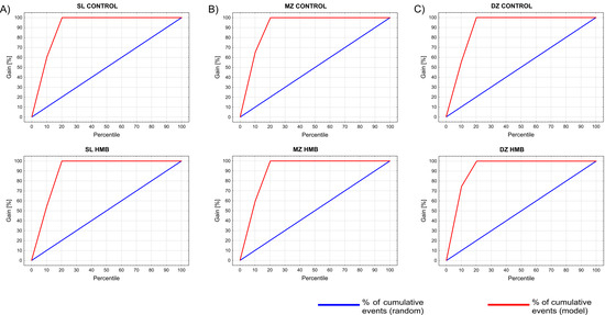 Only one case from the validation set, which was derived from the HMB-supplemented DZ group, was assigned incorrectly to the control DZ group (confusion matrix available in the Supplementary Material, Table S2). Gain charts (Figure 5) constructed for examined groups show that by taking the top 20% (shown on the x-axis) of the cases classified into the corresponding category with the greatest certainty (maximum classification probability), we will correctly classify nearly 80% of all cases.