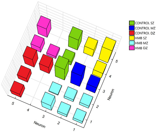 As a result of the training process (Table 4), clustering the SOM network with 25 neurons in the output zone divided the presented dataset into six groups (Figure 6). As can be seen, neurons winning in the training created clusters based on the similarity of given vectors describing the examined groups: control (SZ, MZ and DZ) and HMB (SZ, MZ and DZ). It might be observed that neurons winning for the middle zone and deep zone in the HMB group are located in the opposite corners of the square-shaped network, indicating that SOM considered them completely different. Similar behavior may be seen for the deep zone from the control group and the superficial zone from the HMB group. By contrast, groups such as the middle zone in the control and HMB groups are similar to a greater extent, so they are located close to each other on the SOM map.