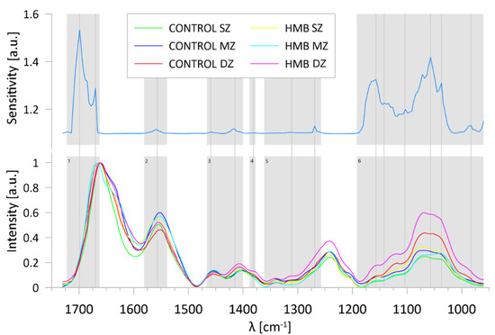 Wavenumber ranges indicated by the ANNs sensitivity analysis with marked peaks in each (grey, vertical lines) and corresponding spectra averaged for each group: (range 1) 1722-1667 cm−1; (range 2) 15981-1539 cm−1; (range 3) 1466-1400 cm−1; (range 4) 1385-1377 cm−1; (range 5) 1361-1257 cm−1; (range 6) 1192-960 cm−1; HMB—supplemented group, SZ—superficial zone, MZ—middle zone, DZ—deep zone.