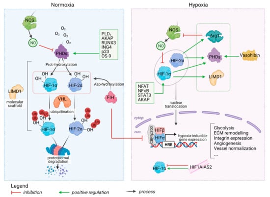 Hypoxia pathway proteins–a regulatory network. Under normoxic conditions, PHDs 1–3 can preferentially hydroxylate HIF1α or 2α, which leads to their VHL-mediated degradation. FIH preferentially hydroxylates HIF1α rather than HIF2α, preventing necessary interaction with co-factors [,]. Additionally, LIMD1, a scaffold protein that helps assemble the complex with VHL [,] and numerous other regulators of PHD expression/activity have been described (green box—Normoxia [,,,,,,]). During hypoxia-associated events, including inflammation or tumor growth, HIF1 is activated (green box—Hypoxia), on the other hand, HIF1 supports the transcription of PHD, LIMD1, and Nitric Oxide synthase (NOS), which in turn inhibit HIF1 activity. HIF2 can induce the expression of Arginase 1, which competes with NOS for the same substrate, thus reducing NO production efficiency and reducing HIF1 inactivation as well [,,,,,]. HIF1α-AS2 promotes HIF1 transcription only in the first few hours after hypoxia induction but subsequently inhibits HIF1 activity; in contrast, HIF1α-AS2 continues to promote HIF2 expression even after several hours of hypoxia [,].