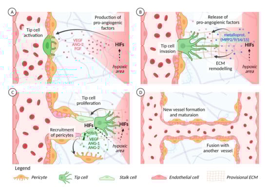 An excellent and well-described example of hypoxia-driven angiogenesis pertains to the retina of mice in the first weeks after birth. In the initial step of sprouting angiogenesis, hypoxic astrocytes in the regions of the retina that show no vascularization express VEGF, which then binds to VEGFR2 on endothelial tip cells []. Concurrently, ANG2/TIE2 interaction eases the vessel wall [], reducing endothelial cell–vascular smooth muscle cell interactions (EC-SMC). The ECs then become activated in response to angiogenic signals that are released in response to hypoxia, including VEGF, ANG2, and FGF (see Figure 2). Hypoxia also induces the expression of metalloproteinases that can cause degradation of the existing ECM, which in turn undergoes structural modifications to morph into a provisional ECM; importantly, these changes lead to the release of several growth factors and proenzymes embedded in the ECM [,].